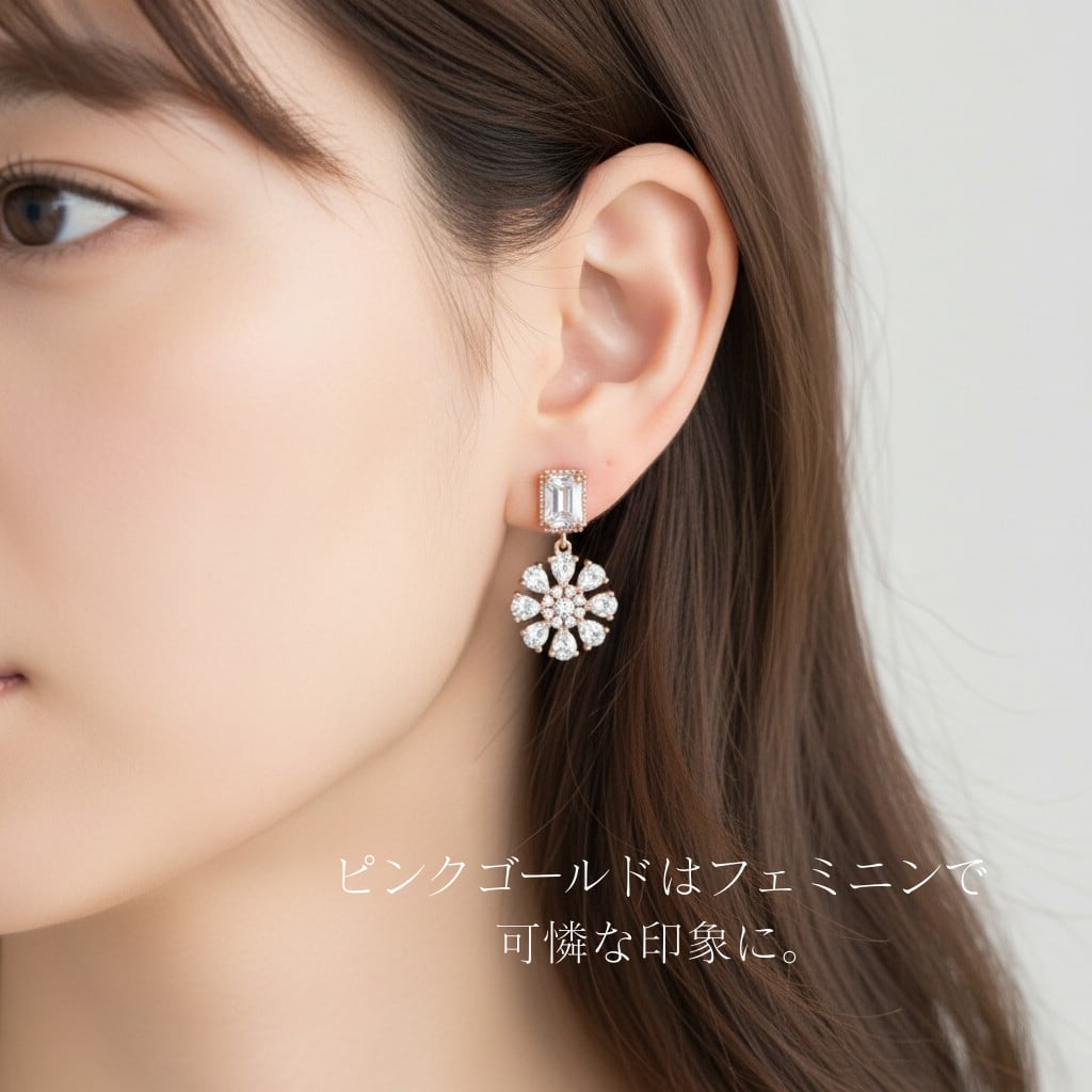 シルバーは顔まわりをすっきりと明るく、ピンクゴールドはフェミニンで可憐な印象を演出し、ゴールドは顔まわりを明るく照らし上品な存在感を放ちます。