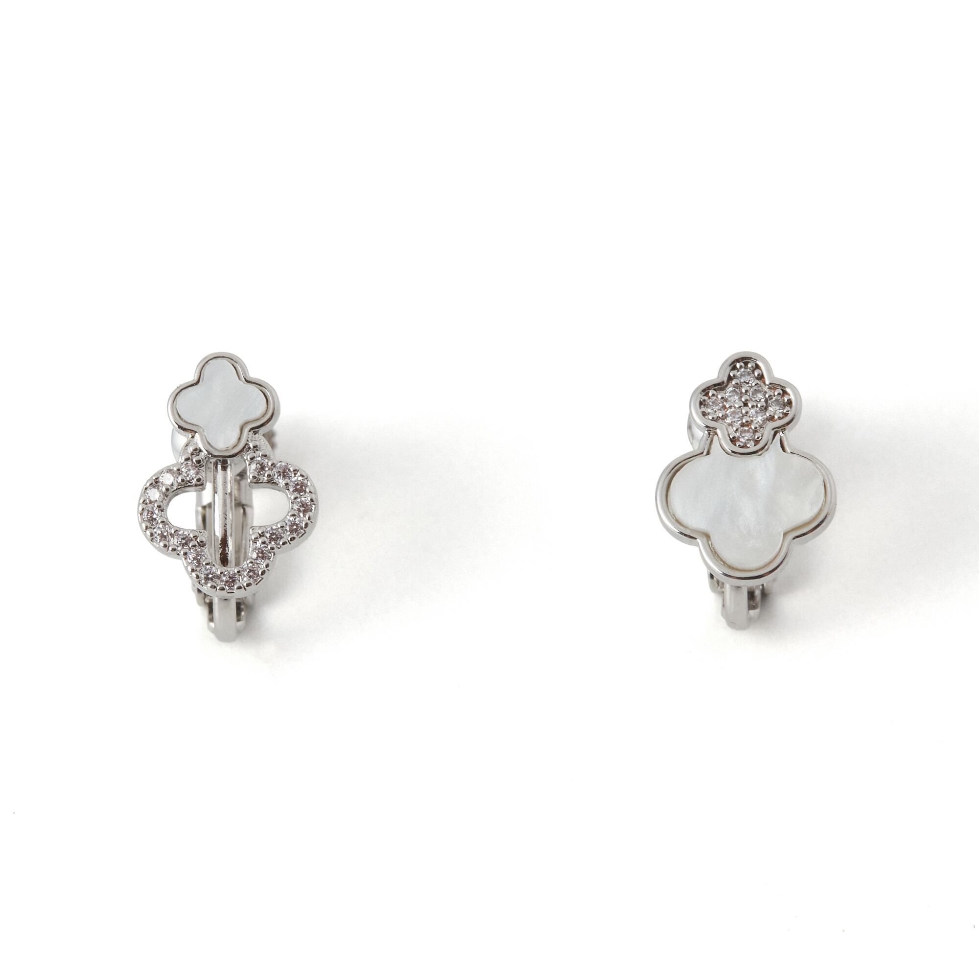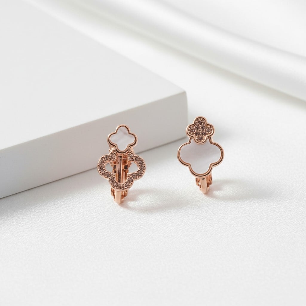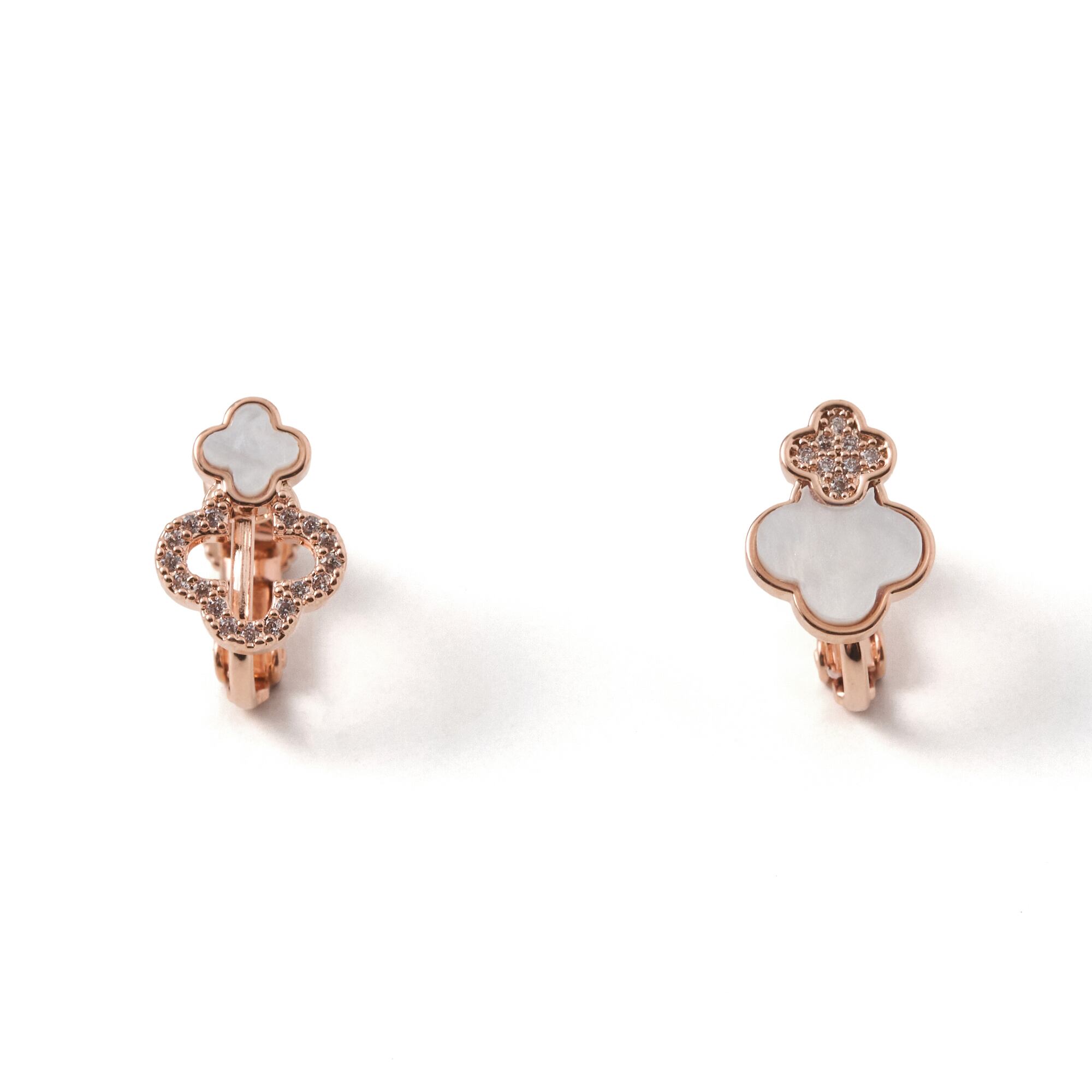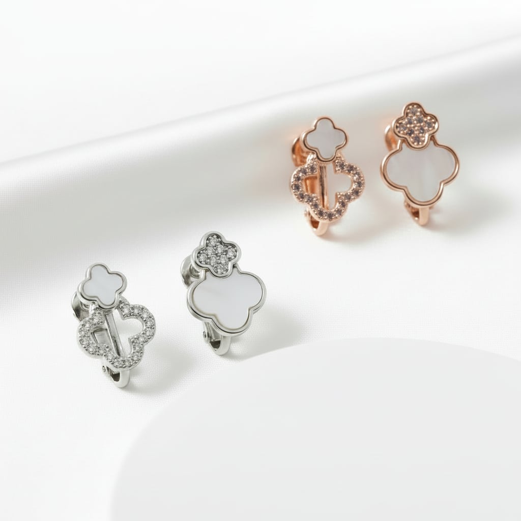 二連に連なったクローバーに繊細なきらめきを添えた上品なイヤリング。