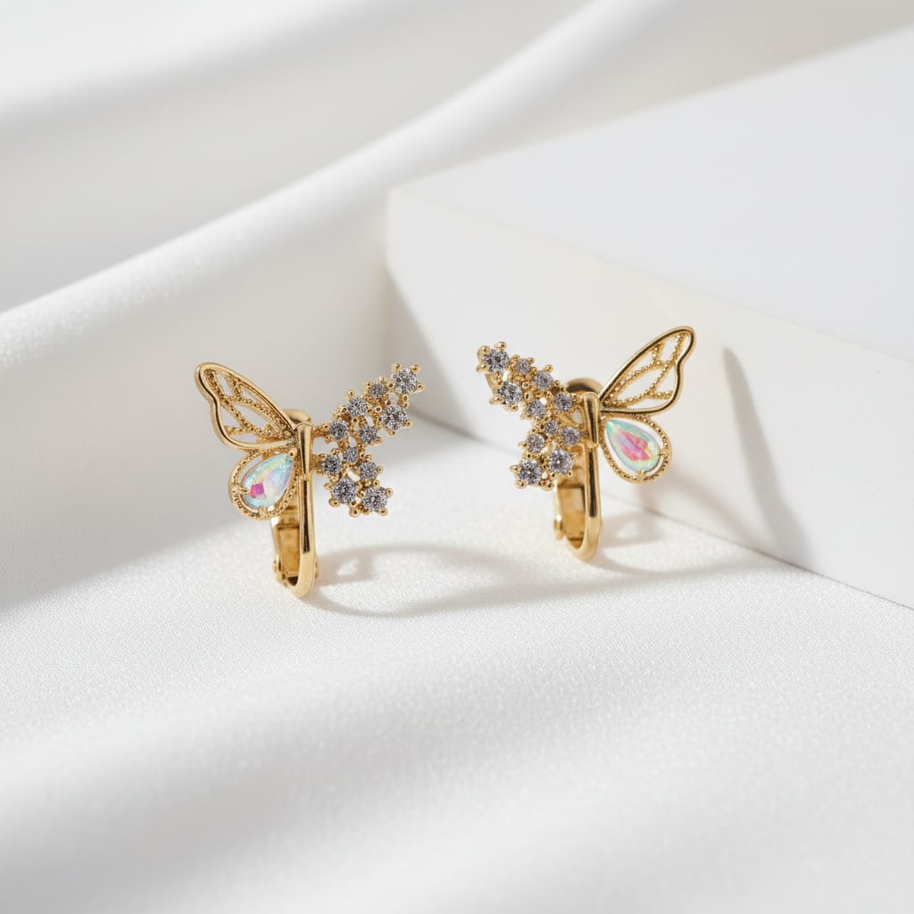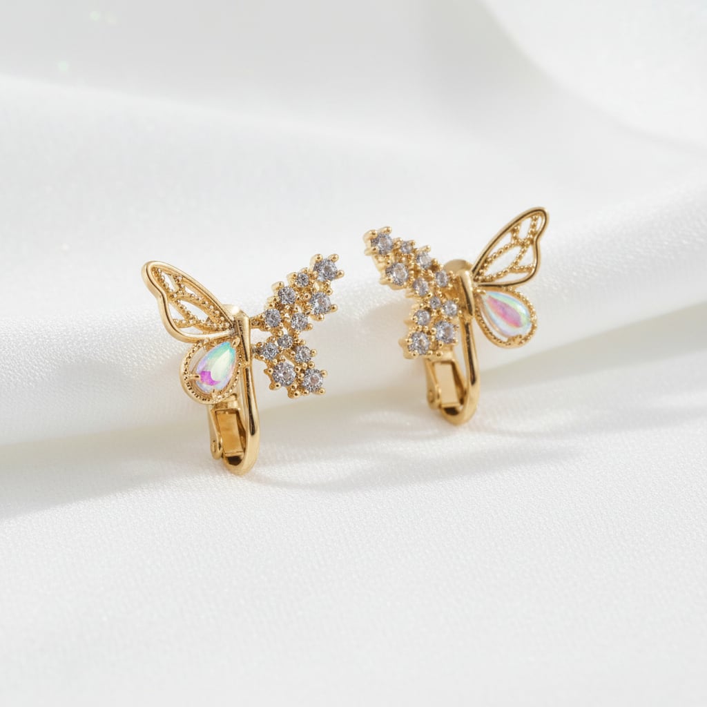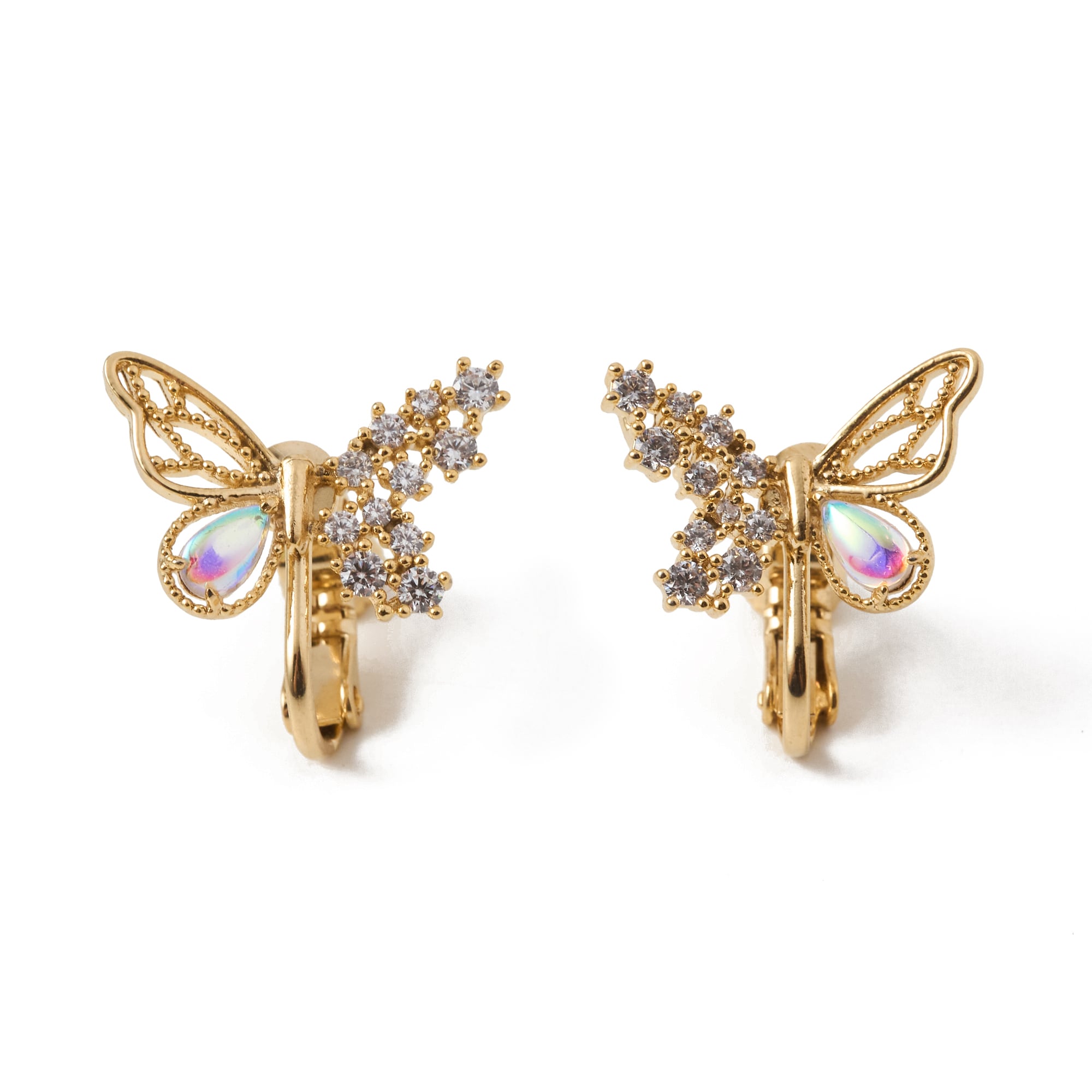 繊細な蝶のデザインにきらめくビジューをあしらった華やかなイヤリング。