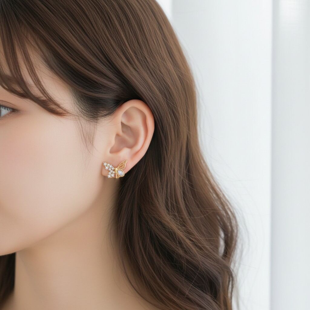 羽の先でさりげなく輝くオーロラカラーのしずくが角度によって表情を変え、耳元に幻想的なきらめきを添えます。