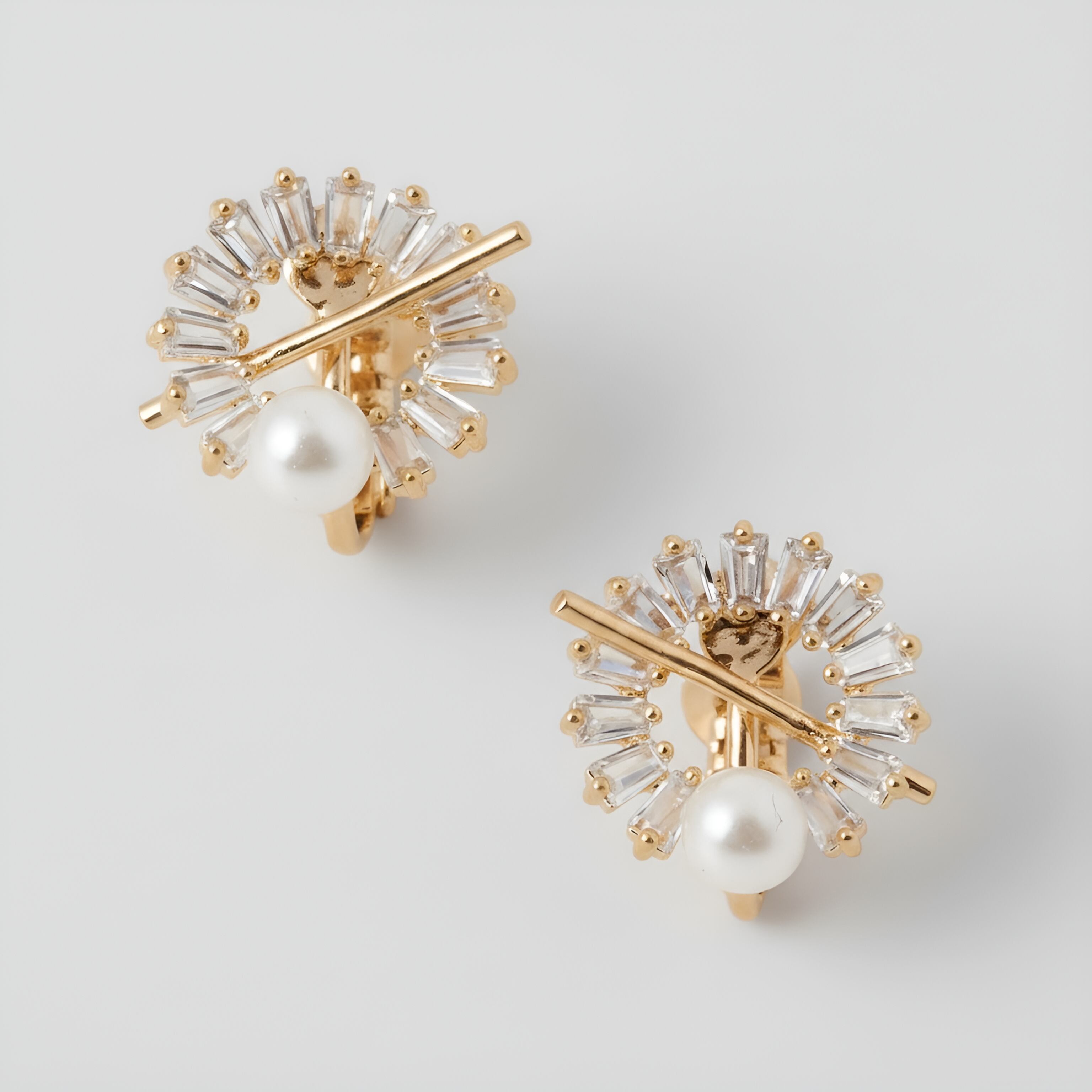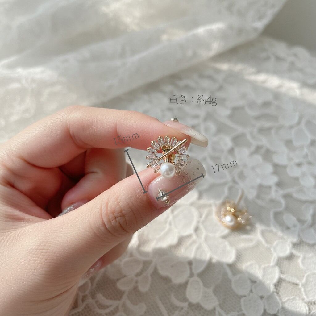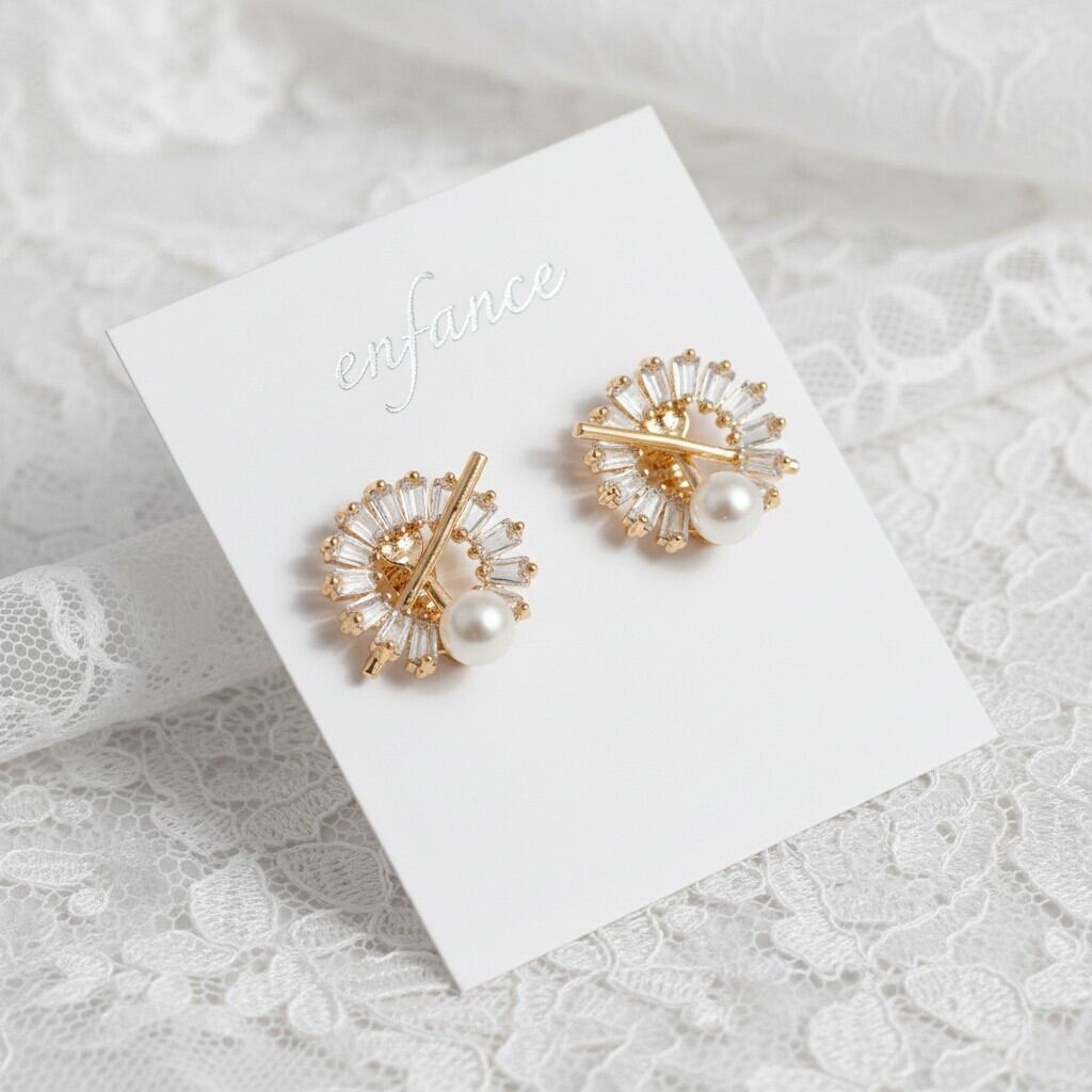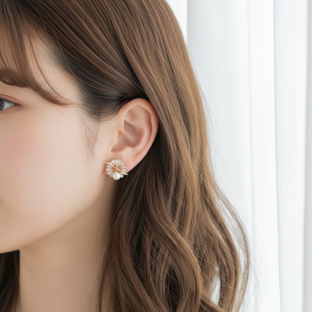 放射状に輝くジルコニアが耳元に華やかさをプラスし、中央の淡水パールが上品さを引き立てます。