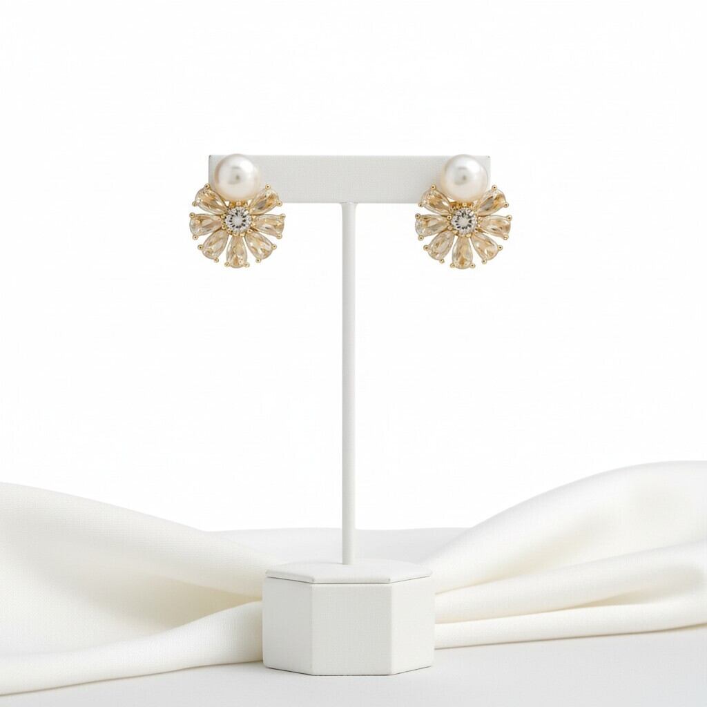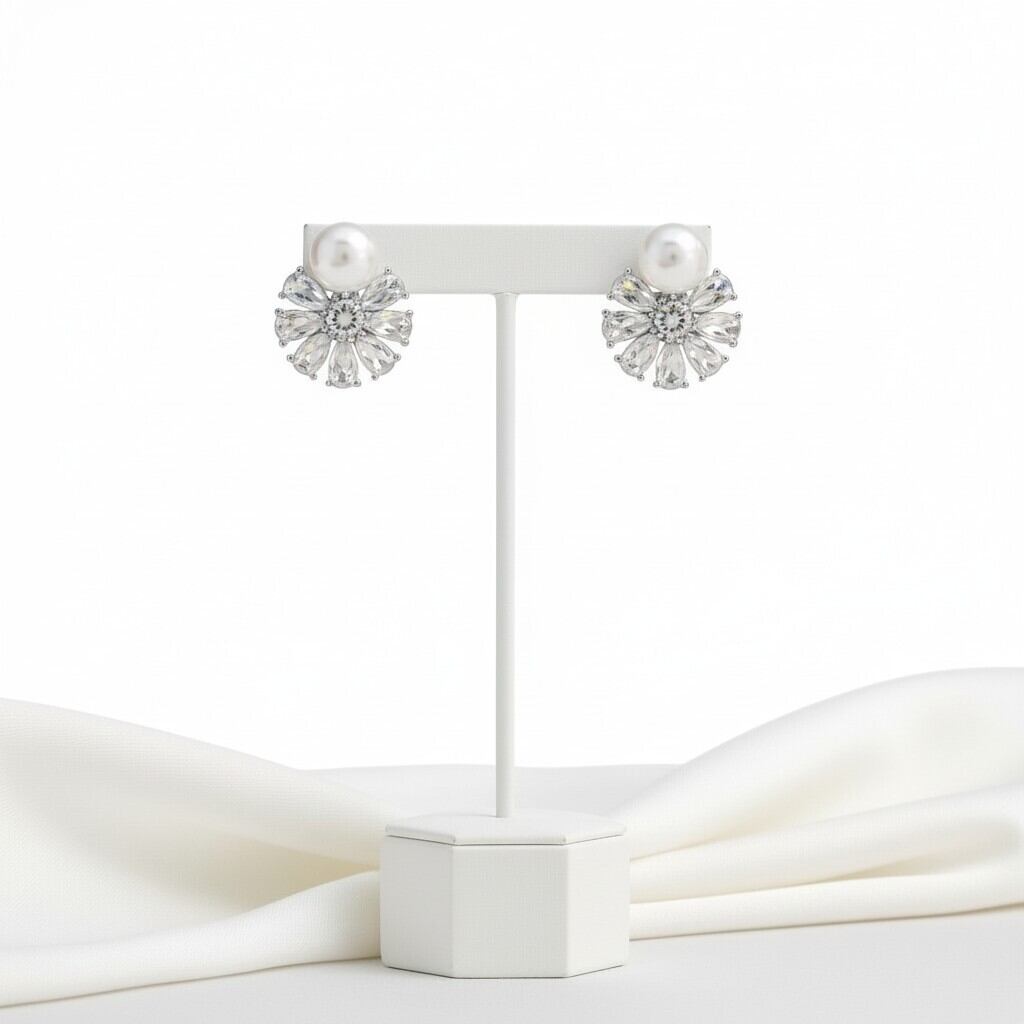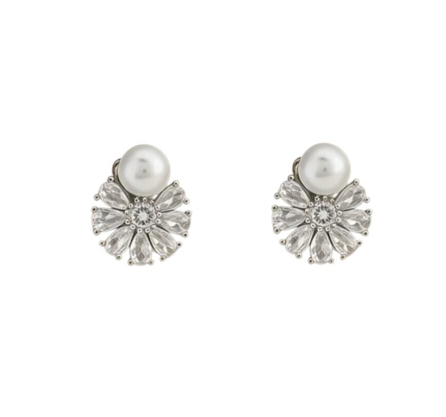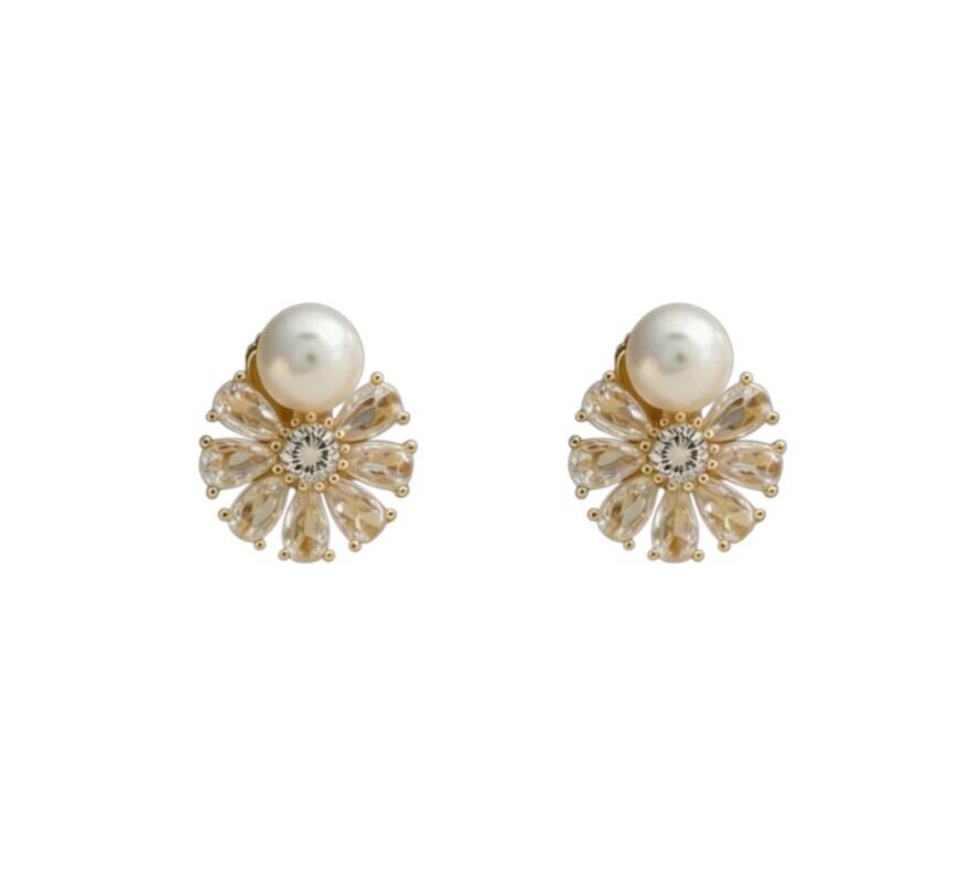パールの上品な艶と中央のストーンから放射状に広がるデザインが、耳元を明るく彩ります。