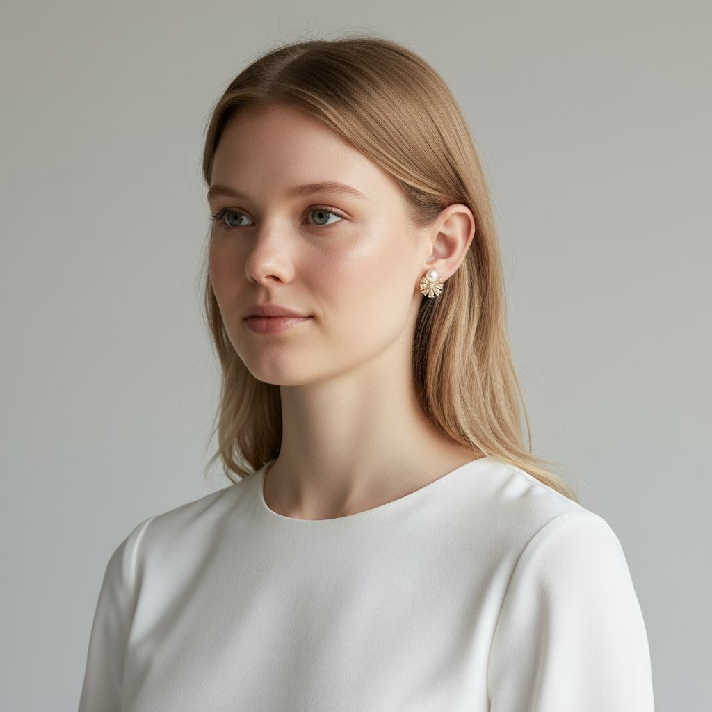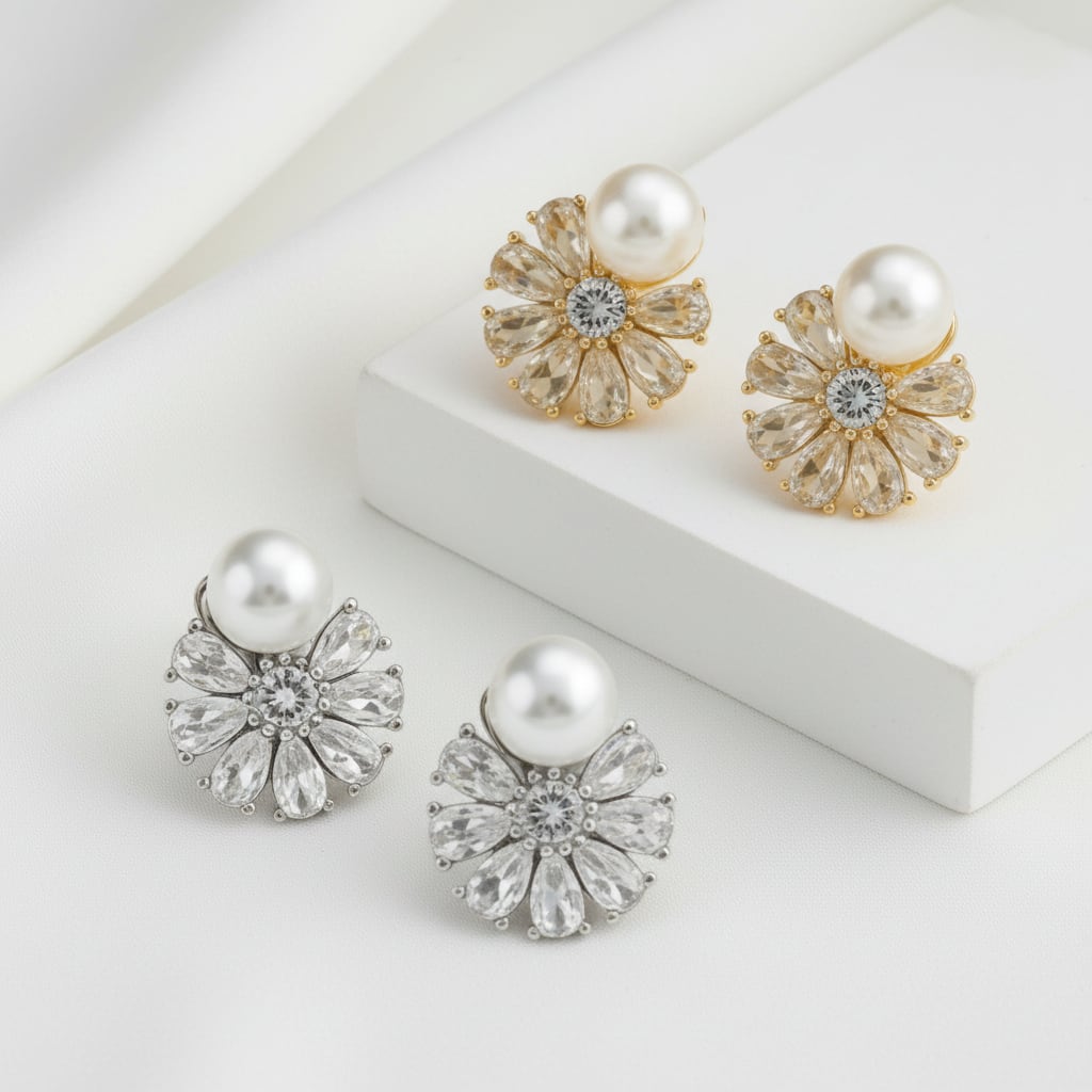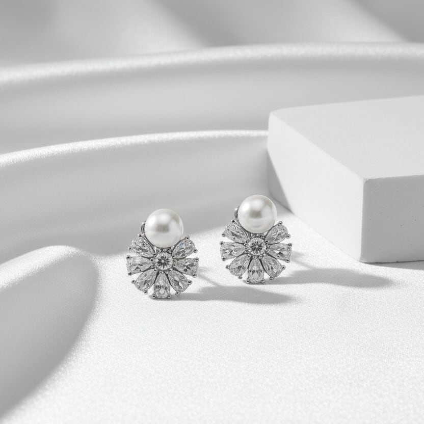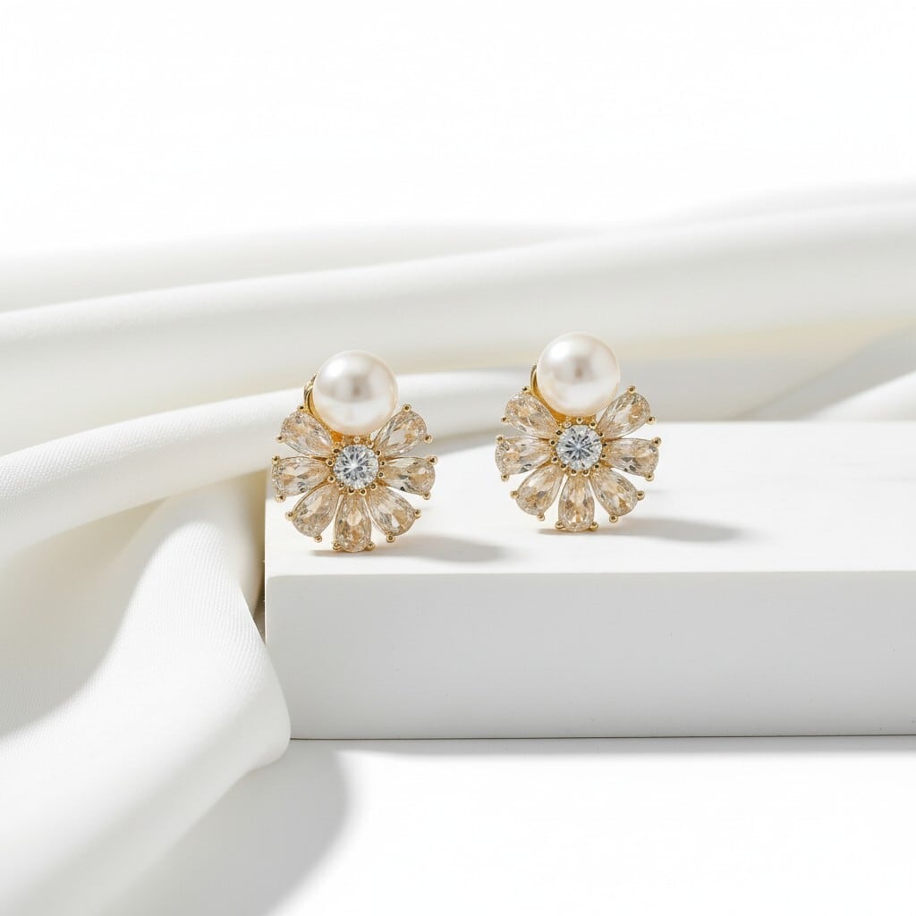 パールの上品な艶と中央のストーンから放射状に広がるデザインが、耳元を明るく彩ります。