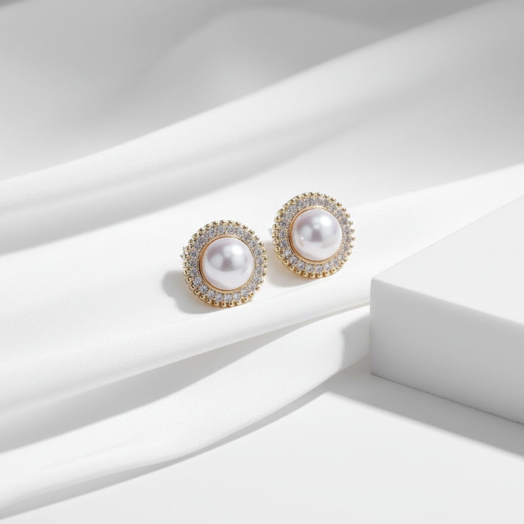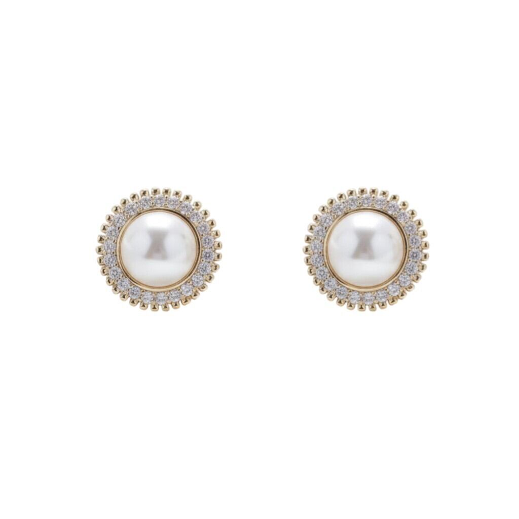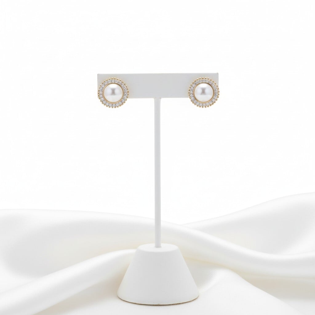 艶やかなホワイトパールを中心に繊細なストーンがぐるりと囲む上品なイヤリング。