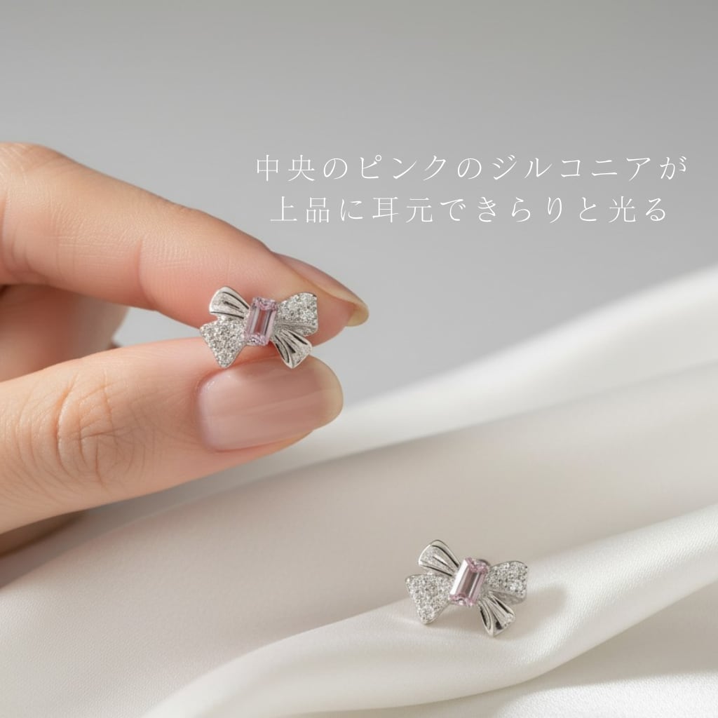 中央のピンクのジルコニアがさりげなく輝く大人ガーリーなミニリボンデザイン。